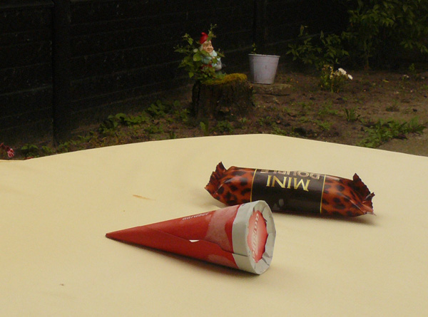 Zomer. Uitsnede gemaakt, zodat de blik getrokken wordt naar de ijsjes en naar de tuinkabouter.